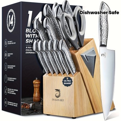 14pcs Knife Set with Sharpener & Knife Holder - Heavy-Duty Dishwasher Safe Knives