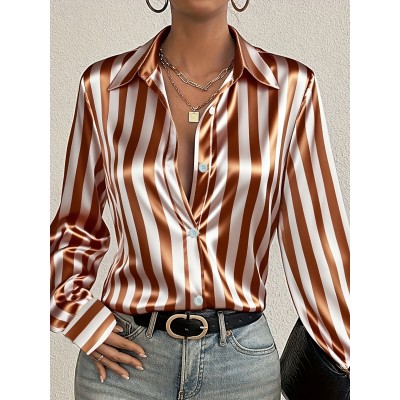 Plus Size, Plus Size Striped Print Elegant Long Sleeve Collared Shiny Shirt